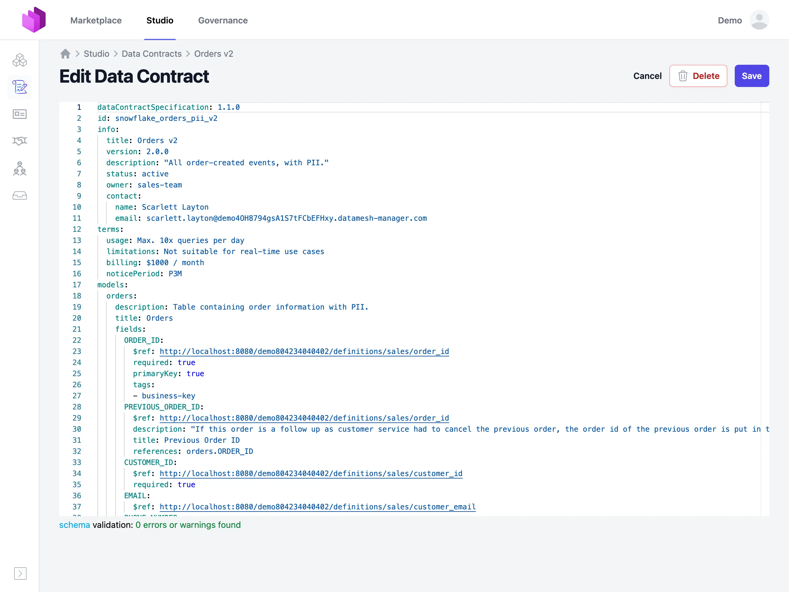 - Both is supported: Create data products from existing data sets in your data platform or data catalog and put them under contract. Or draft new data contracts for your data requirements and create data products that implement them.