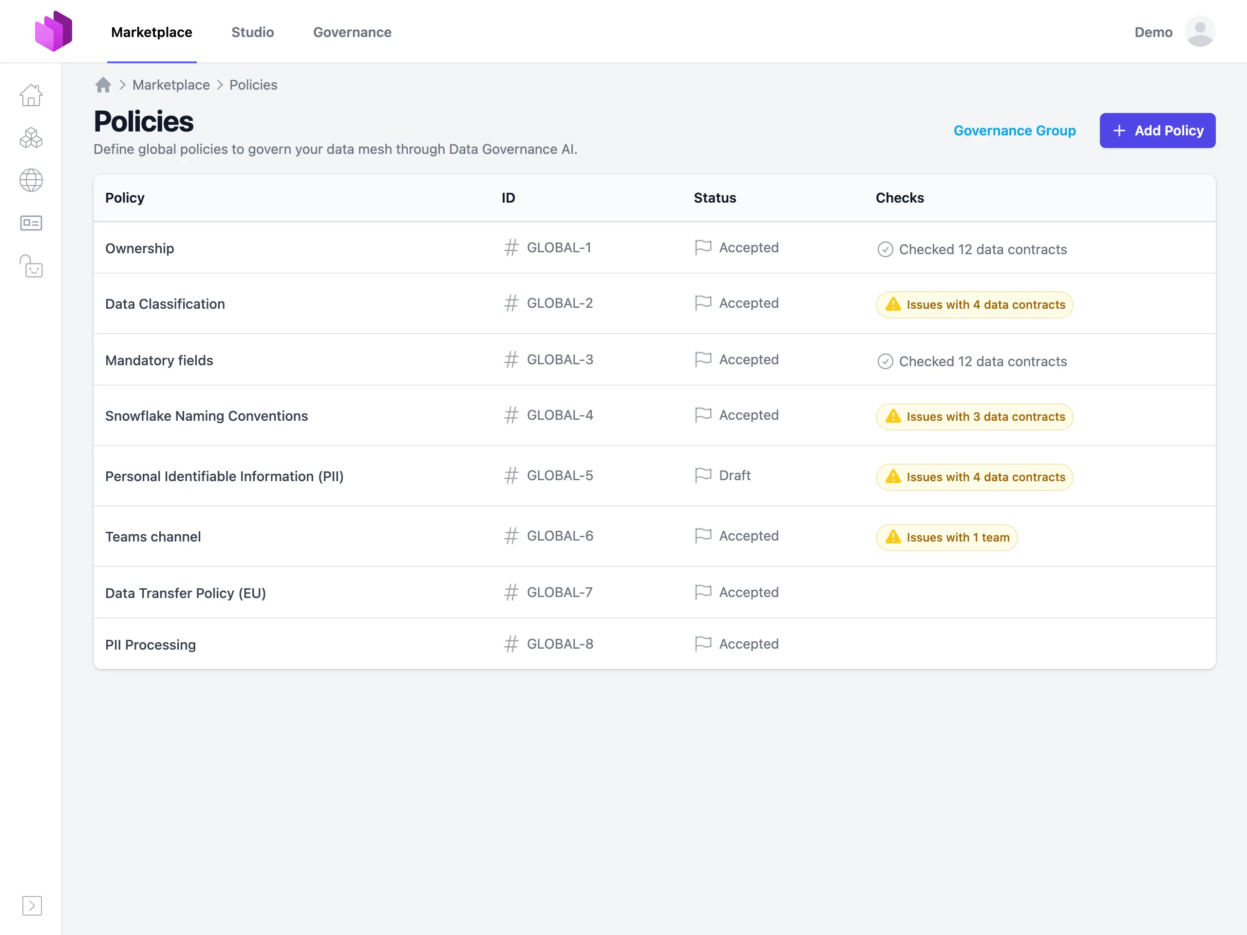 - Data Governance checks use AI to automatically check if your policies are correctly applied in your data products and data contracts. Rely on our pre-trained and managed Data Governance AI Assistant, or use your own hosted model (even on-premise).