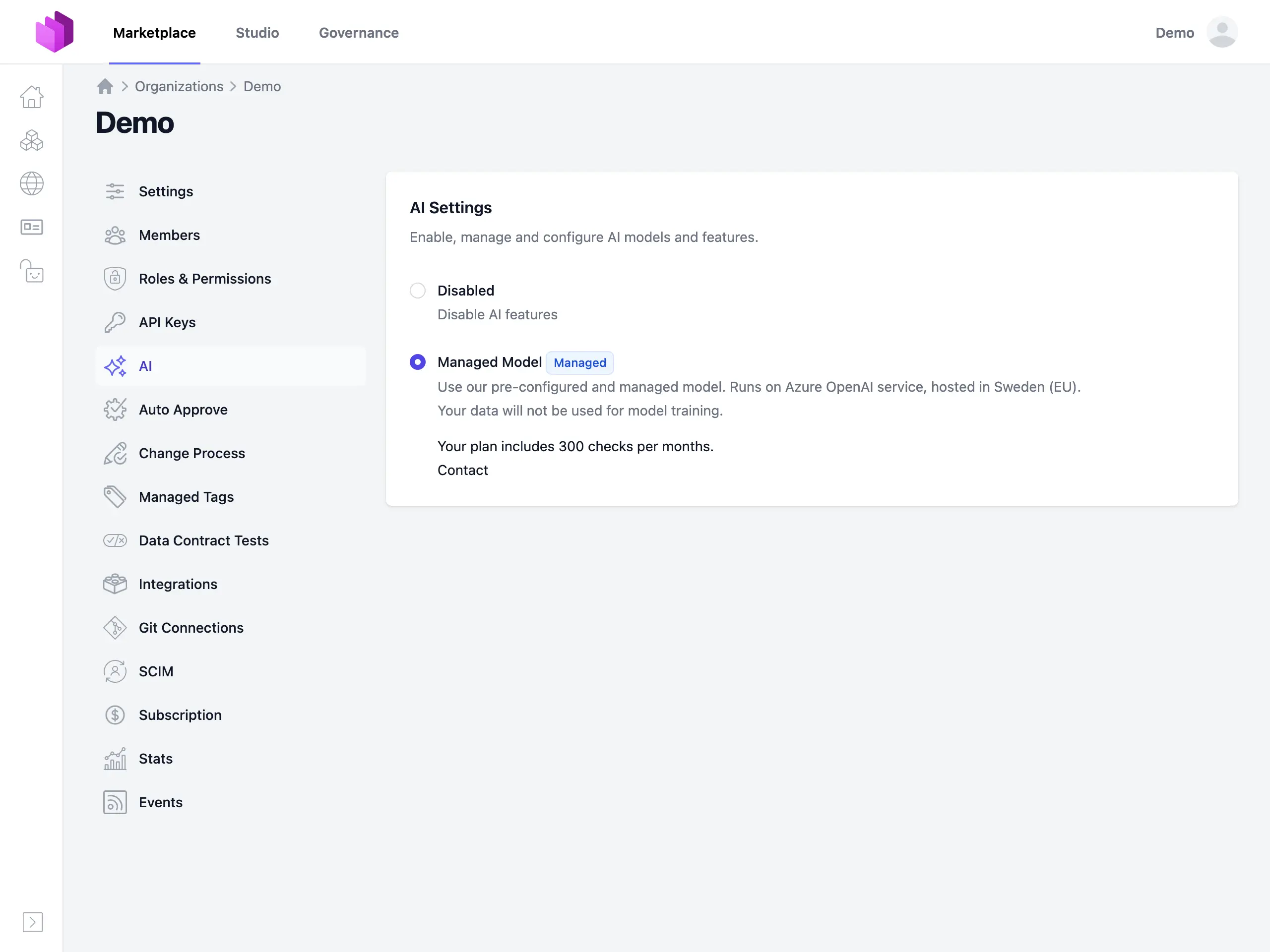 - Data Governance checks use AI to automatically check if your policies are correctly applied in your data products and data contracts. Rely on our pre-trained and managed Data Governance AI Assistant, or use your own hosted model (even on-premise).